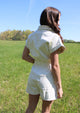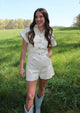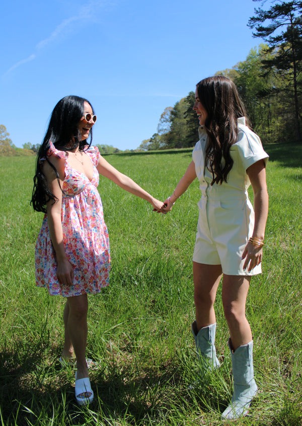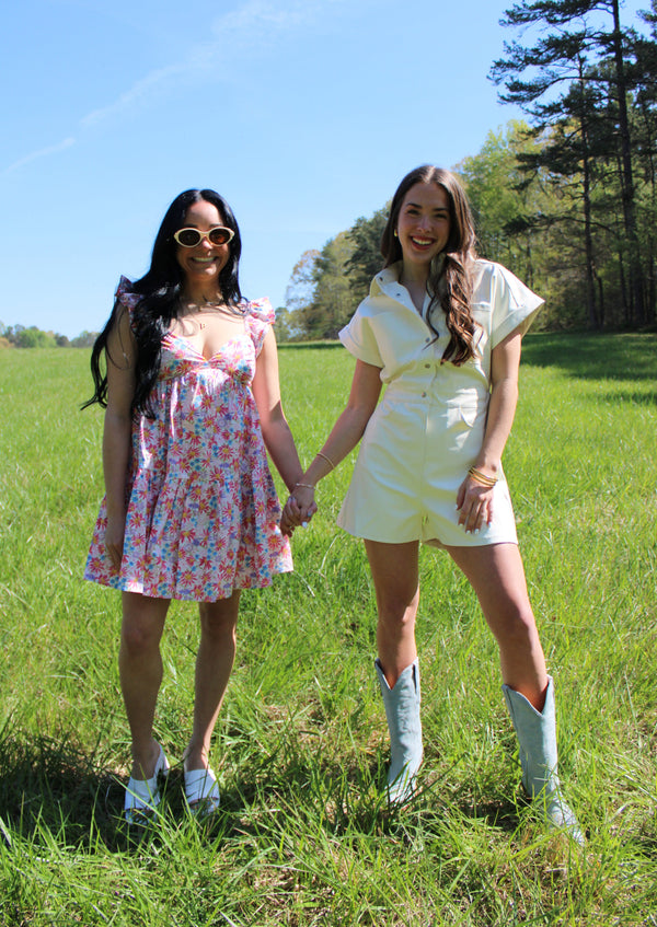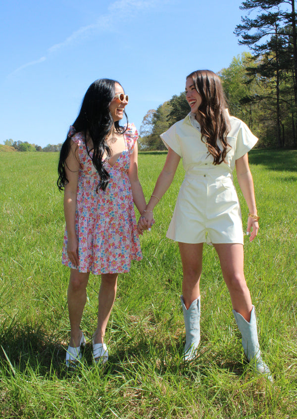 Obsessing over this romper! Faux leather collared button up romper featuring utility pockets at bust. Pockets at front. Zipper front closure. Elastic waistband at back. Unlined. Woven. Non-sheer. Lightweight. Perfect for the spring & summer + gamedays!