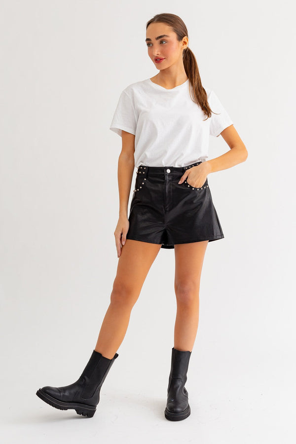 Get ready to turn heads in these Studded Faux Leather Shorts! Made from high-quality faux leather, these shorts feature stylish stud detailing and convenient side pockets. Perfect for adding an edgy and playful touch to any outfit, these shorts will quickly become a staple in your wardrobe!