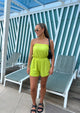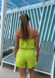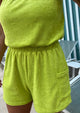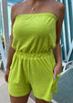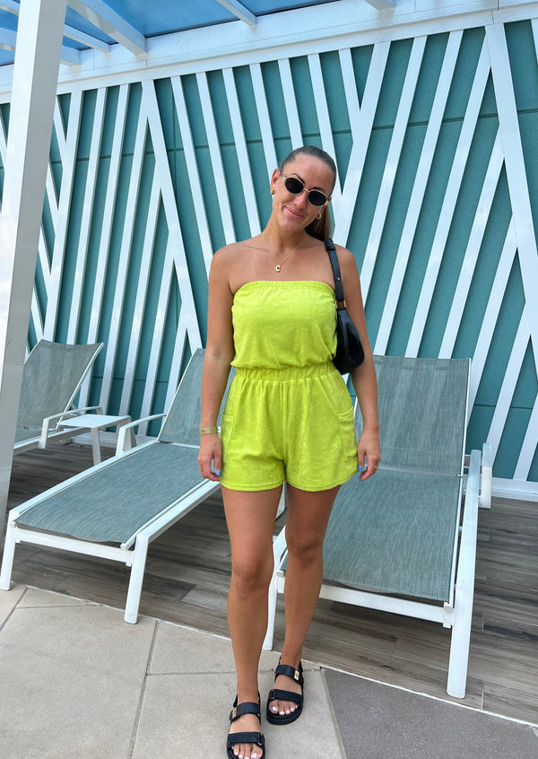 Indulge in the ultimate comfort and style with our Brooke Key Lime Terry Cloth Romper! This strapless romper features terry cloth fabric, perfect for those warm summer days. Features an elastic waistband and side pockets. Experience the benefits of both comfort and fashion with this must-have addition to your wardrobe!