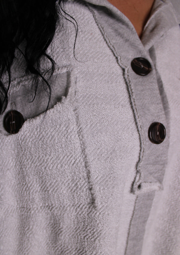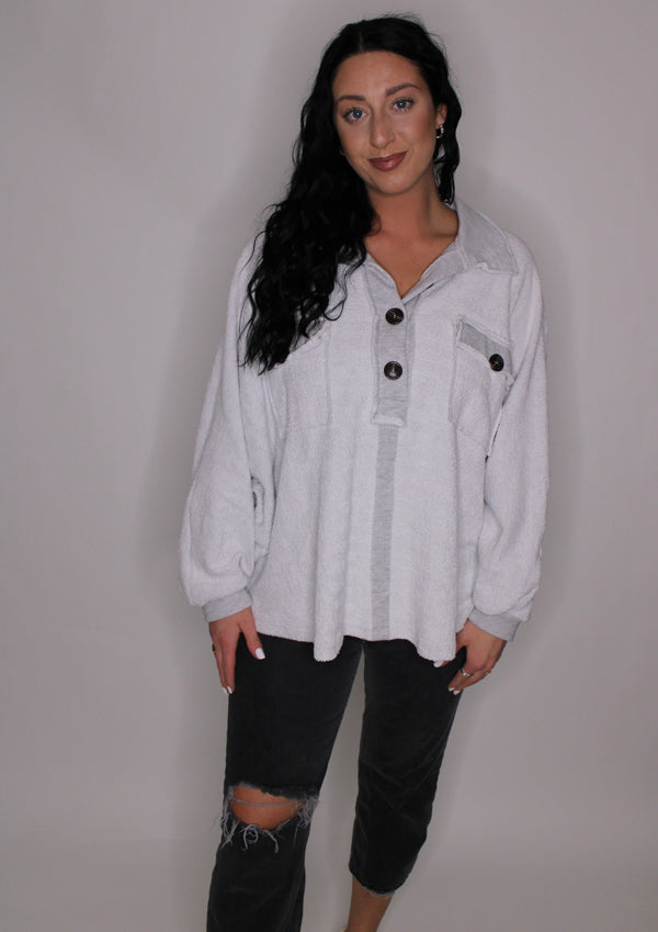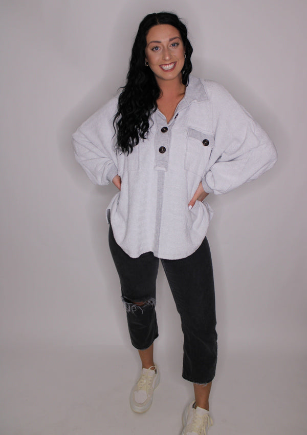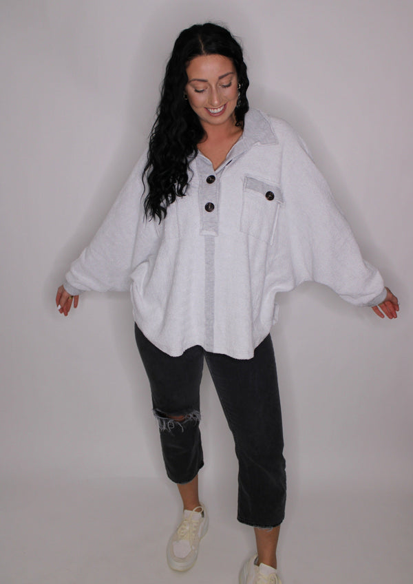 We predict this to be a sell out! The Carly Henley is one of the most versatile pieces you could ever have! This henley style top features a french terry material, a button up closure, a collared neckline, and an oversized fit. Pair this one with leggings, jeans, or joggers!