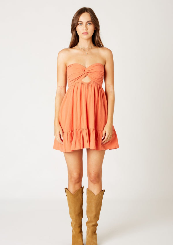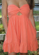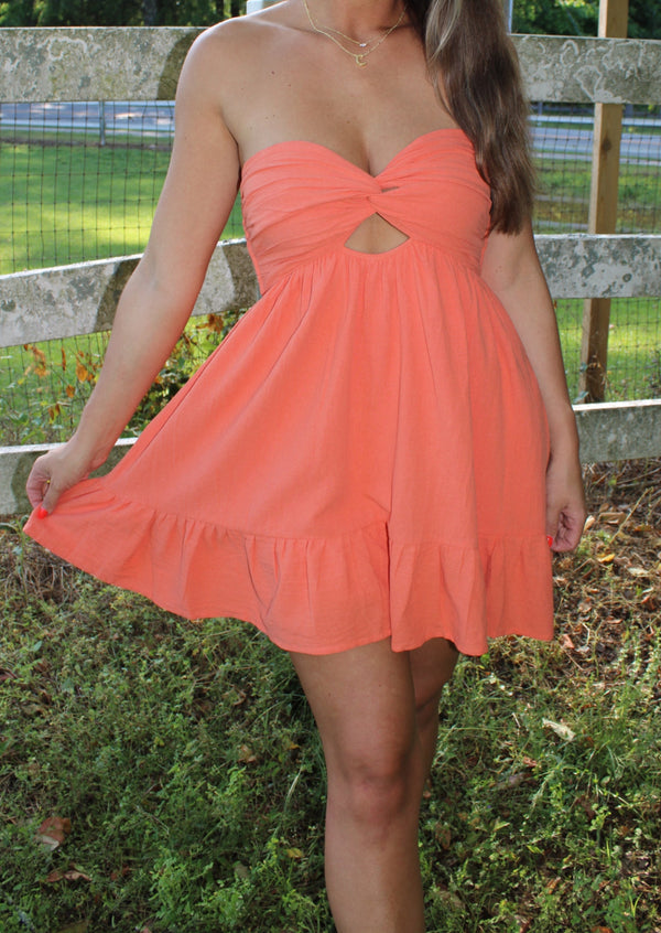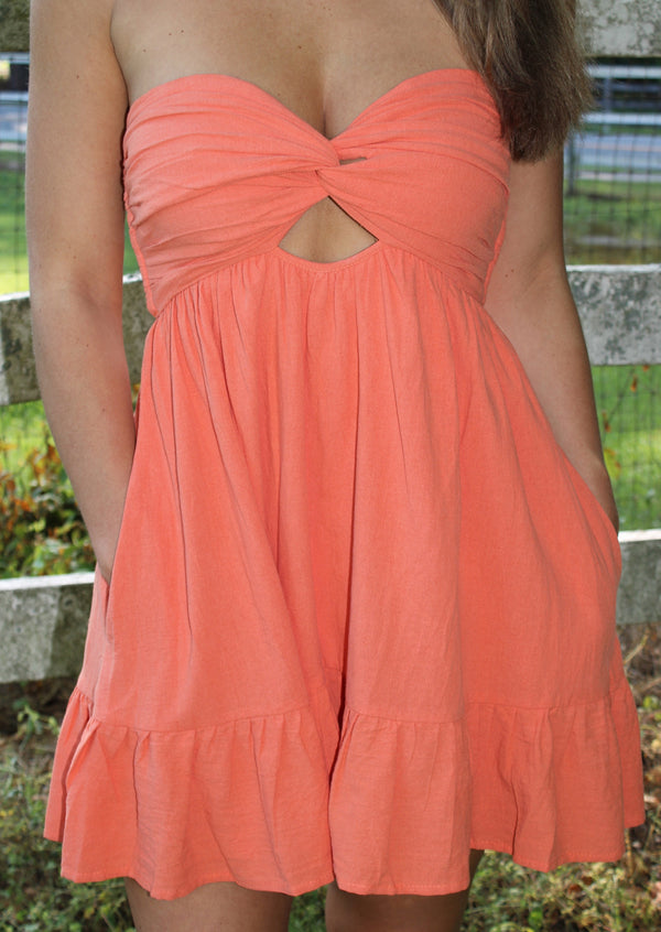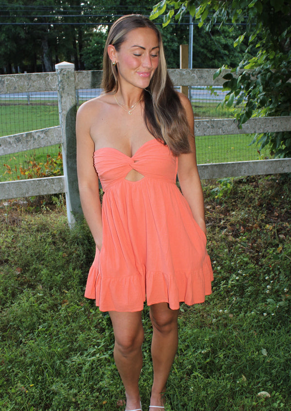 Experience chic and effortless style with the Claudia Romper Mini Dress. The front cut out detail and ruffled hem add a playful touch, while the double cinched elastic back detail ensures a perfect fit. With built-in shorts and pockets, this strapless mini dress is both fashionable and functional. This dress is a must have for your wardrobe!