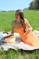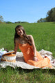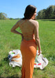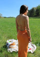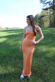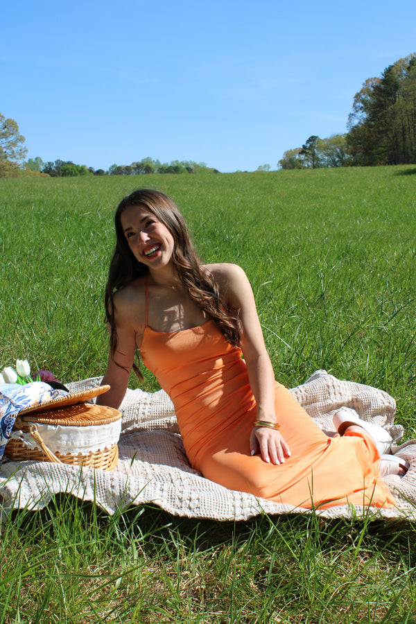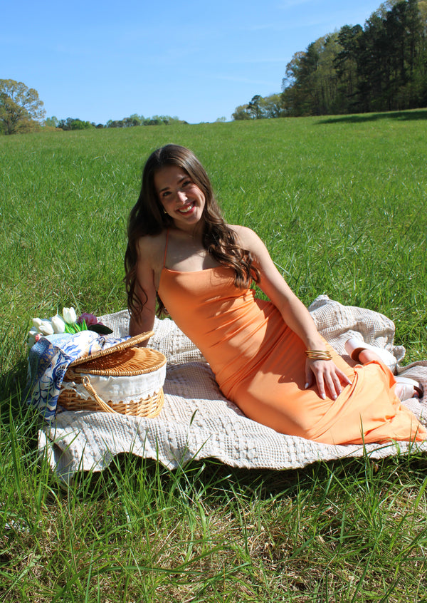Our Orange Ya Glad Dress is a stretchy, flattering, bodycon ankle length dress. It also features a strappy crisscross back. The bodycon fit hugs your curves in all the right places, while the stretch fabric ensure a comfortable fit. The crisscross back detail adds a touch of edge, while the ankle length makes it a versatile piece you can dress up or down. Plus - the color is perfect for the spring and summer!