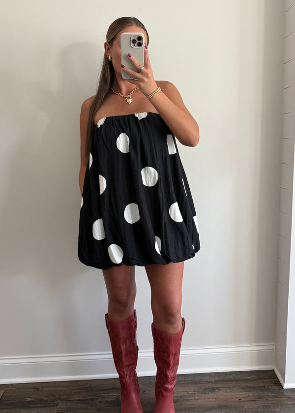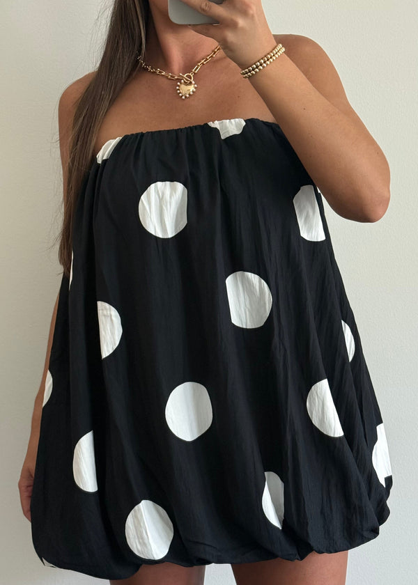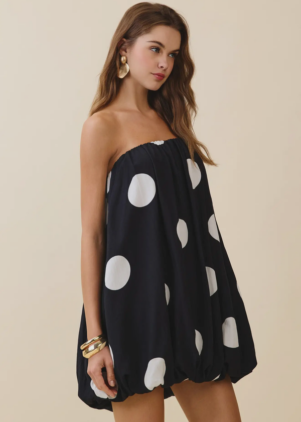 A strapless bubble mini dress designed with a playful oversized polka dot print. Features a voluminous silhouette with a gathered elastic neckline and hem that create a soft balloon shape, finished with a concealed back zipper closure. + POCKETS!