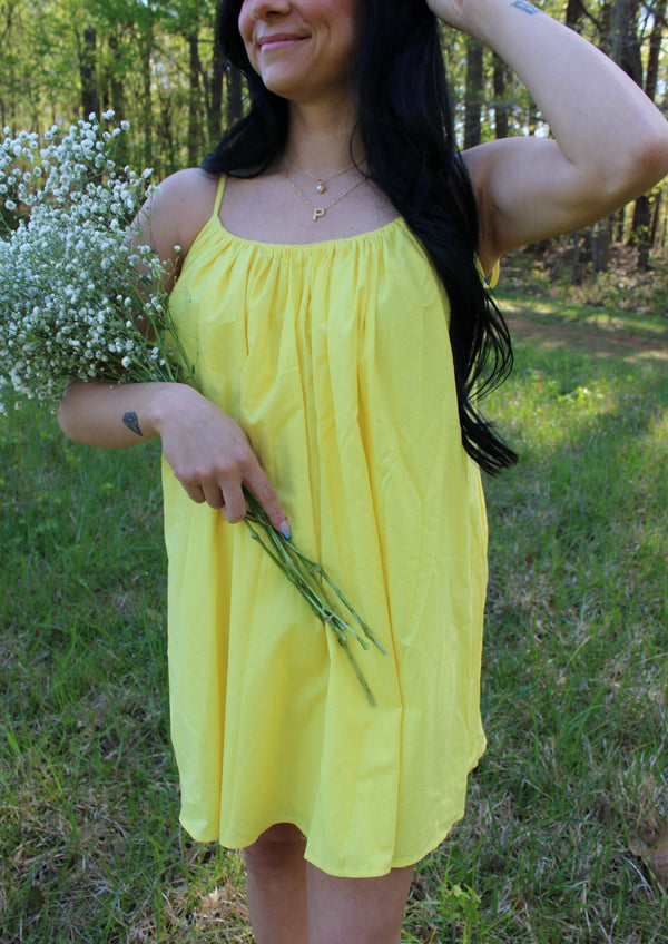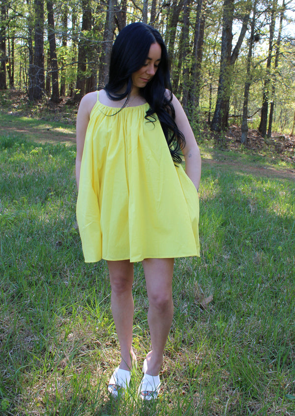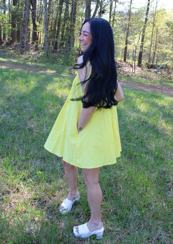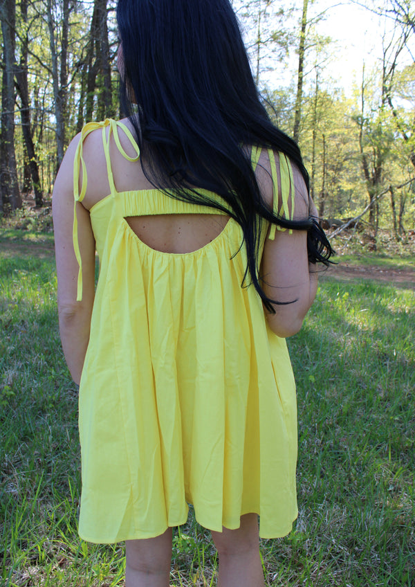 Indulge in the sunny vibes with our Sophie Yellow Mini Dress! Featuring a vibrant yellow hue and self-tie shoulder straps, this dress is perfect for any summer occasion. The convenient pockets and playful open back detail add functionality and charm. Elevate your style game with this must-have dress!