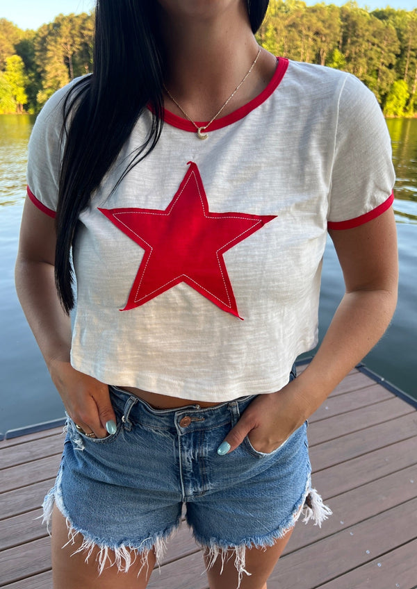 This star-spangled cropped baby tee is perfect for looking stylish and festive! With star detailing and a classic crew neckline, this tee is both trendy and comfortable. Wear this top for a fun and playful look at your next event!