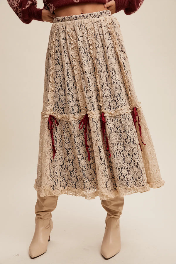 Indulge in luxury with our Stevie Tiered Lace Maxi Skirt. Crafted with delicate lace tiers and accentuated with velvet bows, this skirt is truly a work of art. The built-in velvet lining adds a touch of opulence, while the elastic waistband and hidden pockets provide both comfort and practicality. Elevate your wardrobe with this piece!