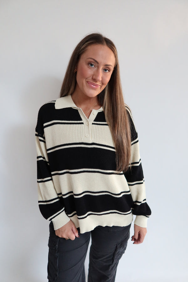 Get cozy with the Catie Striped Sweater Top! This collared sweater top features a trendy henley style and a relaxed fit for ultimate comfort. Perfect for any occasion, this top is sure to keep you both stylish and warm.