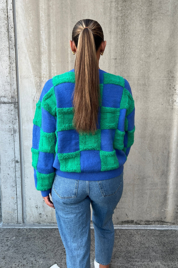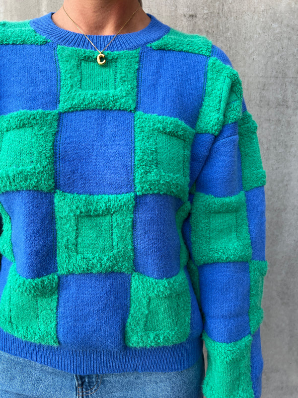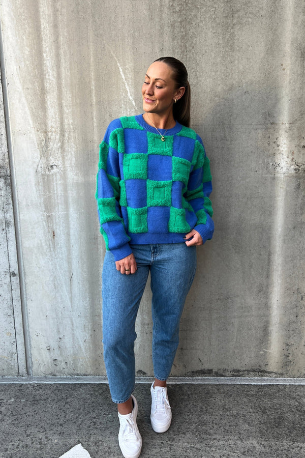 Stay cozy and stylish with our Dakota Sweater. Featuring a textured checkered pattern and ribbed edges, this relaxed fit sweater is perfect for any occasion. We cannot get enough of this blue and green color combination.