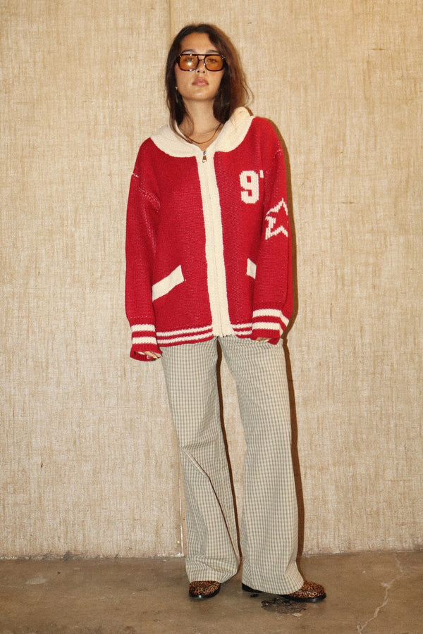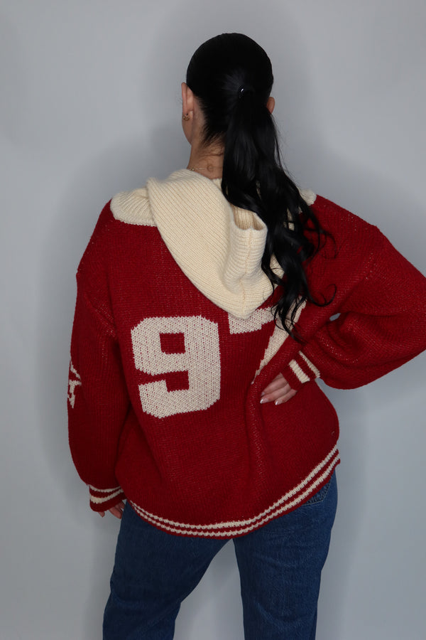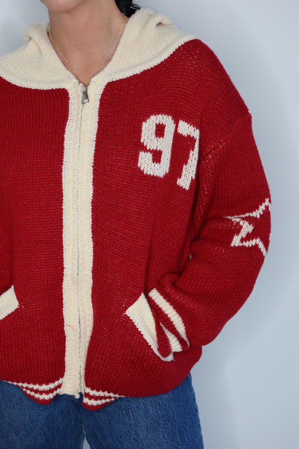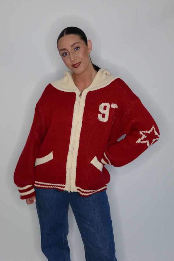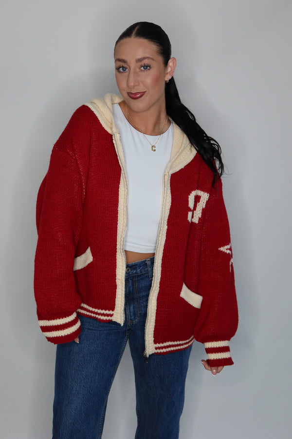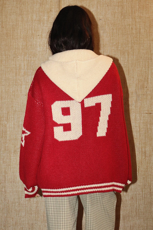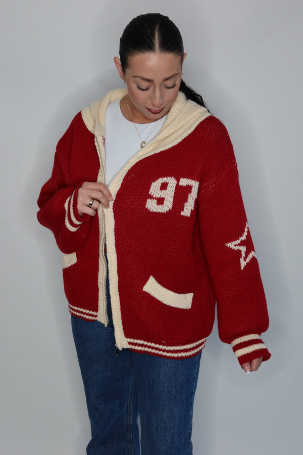 Stay cozy and cool in our So High School Knit Zip-Up. With an oversized fit, pockets, and a hoodie, this knitted jacket is perfect for any occasion. Plus, the embroidered "97" adds a touch of fun and personality. Stay warm and stylish with this must-have piece.
