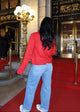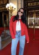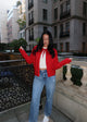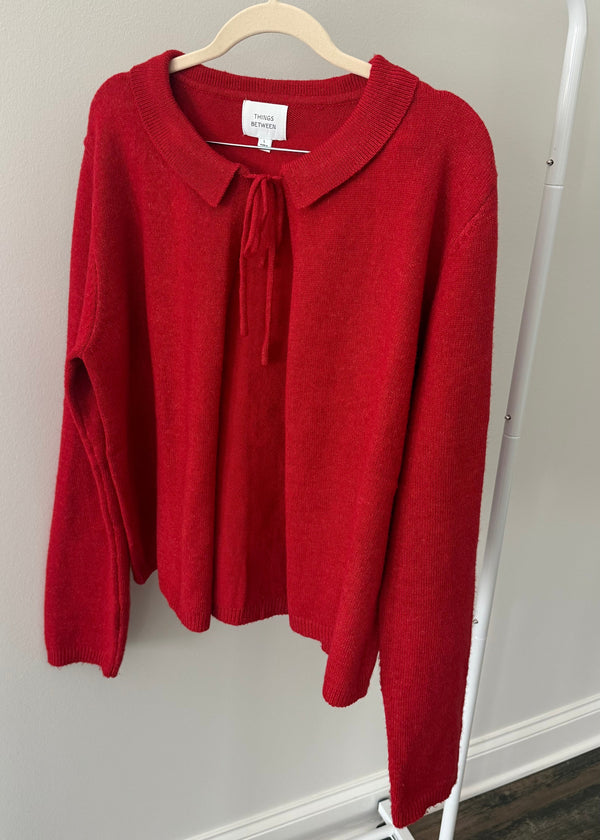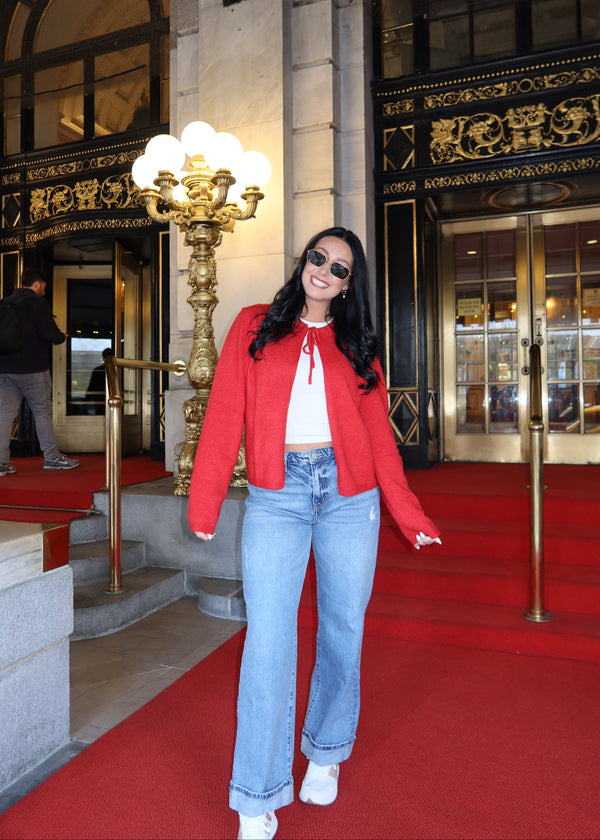 This cherry red open bow cardigan is the perfect playful twist on a classic sweater. Featuring a cozy collar and a charming tie at the top. Designed to keep you comfortable while making a fun fashion statement wherever you go!